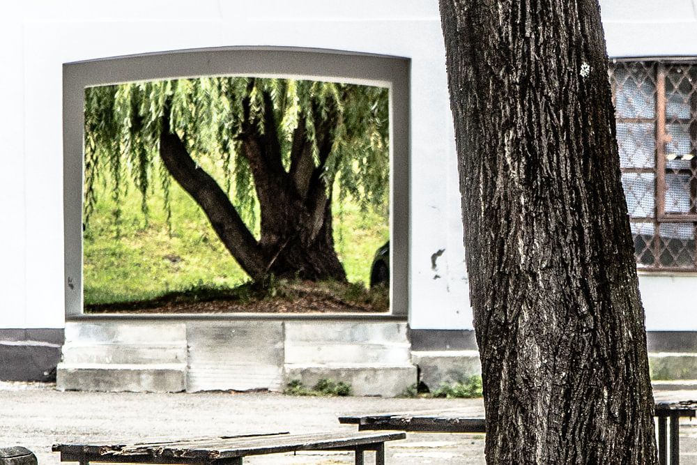 Blick auf einen Baum in einem Innenhof mit Holztischen.