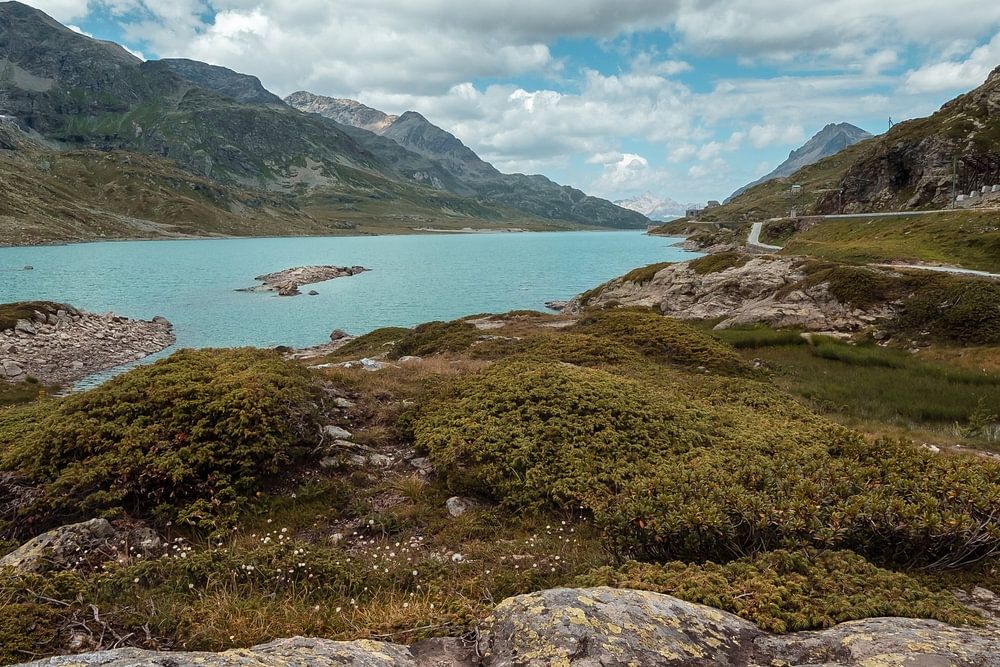 Wunderschöner Blick auf das türkisfarbene Wasser des Lago Bianco am Berninapass hoch in den Schweizer Alpen mit einem dramatisch bewölkten Himmel.