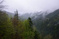 Ein düsterer Tag mit viel Regen und Nebel. Es kann aber auch schön aussehen, wie wir feststellen, als wir vom Aussichtspunkt Studentenfelsen in der Nähe der Stadt Oppenau in Deutschland den Nationalpark Schwarzwald überblicken.