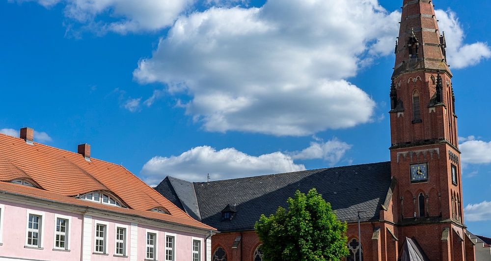 Blick auf die Dessauer Altstadt mit Kath. Kirche St. Peter und Paul Stadt Dessau-Roßlau, Sachsen-Anhalt Deutschland