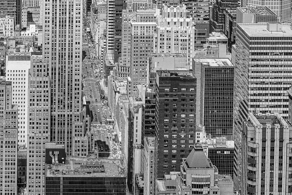Blick vom Empire State Building auf die Hochhäuser von Midtown Manhattan in NYC in schwarz-weiß