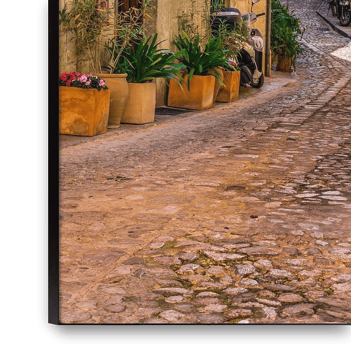 Bestelle das Foto Blick auf eine idyllische Straße in dem mediterranen Dorf Fornalutx von Alex Winter als Reproduktion auf Leinwand, Alu-Dibond, als Poster, Fototapete oder Acrylglasbild.