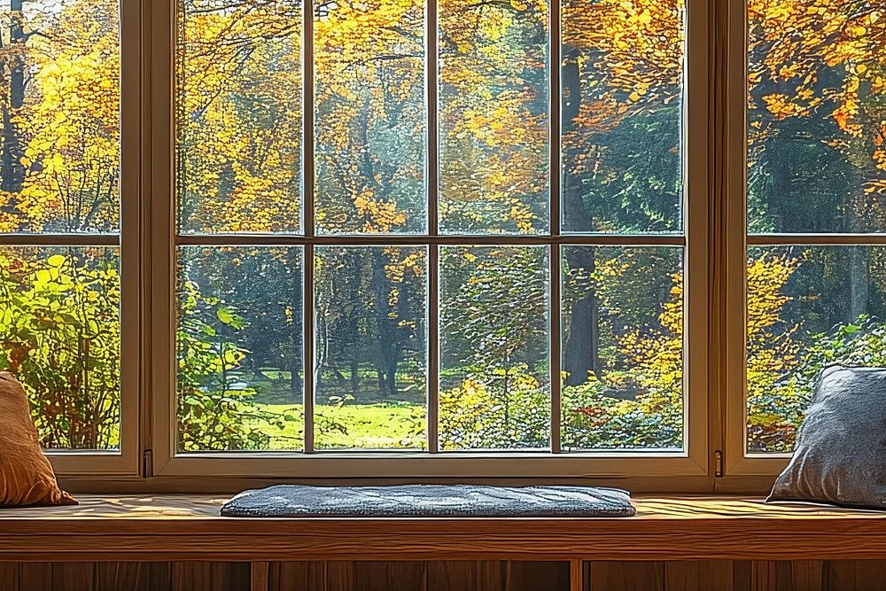 fotorealistisches digitales Bild des Blicks vom Haus auf eine schöne Landschaft oder einen Garten mit feinen Details und leuchtenden Farben