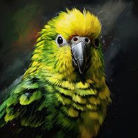 Blick eines Papageis | Papageienporträt - Das lebendige Porträt eines Papageis im digitalen Realismus bringt mit seinen ausdrucksstarken Augen und dem detaillierten Gefieder einen verspielten und doch intensiven Look in den Raum. Der Hintergrund in neutralen, dunklen Tönen bietet einen schönen Kontrast und hebt die grünen und gelben…
