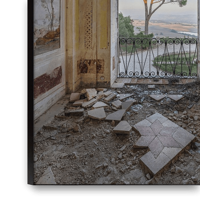 Bestelle das Foto Blick in die verlassene Villa bei Sonnenuntergang von Ruud van der Aalst als Reproduktion auf Leinwand, Alu-Dibond, als Poster, Fototapete oder Acrylglasbild.