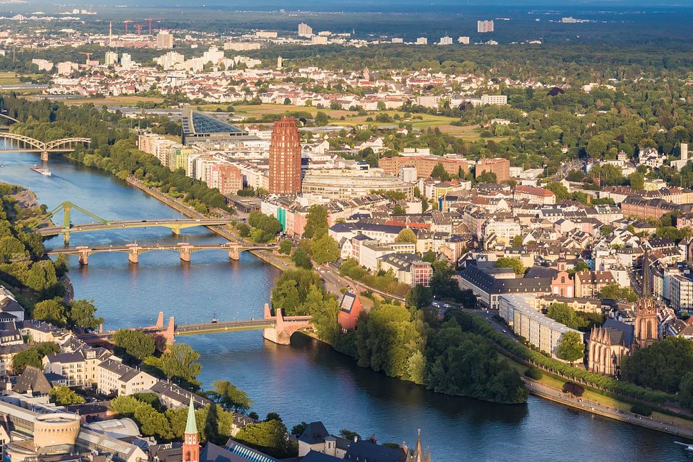 Blick über die Commerzbank, den Dom, die Paulskirche und die Europäische Zentralbank in Frankfurt am Main.