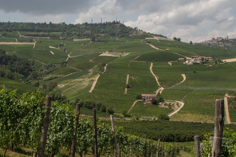 Blick über Hügel und Felder mit Weinbergen Piemont, Italien