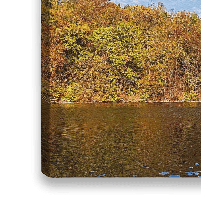 Bestelle dieses Landschafts-Wandbild Blick über den See Schmaler Luzin auf die herbstliche Feldberge von Rico Ködder als Reproduktion auf Leinwand, Alu-Dibond, als Poster, Fototapete oder Acrylglasbild.