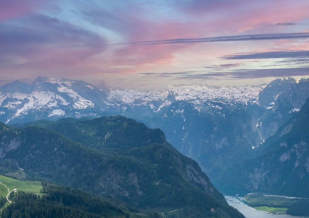 Blick über die Berge des Salzkammerguts in Österreich mit einem See