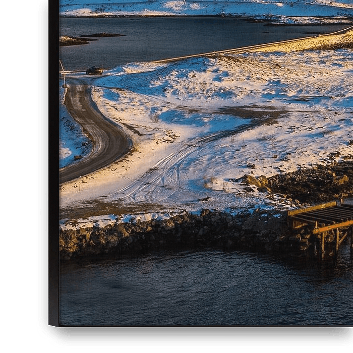Blick über die Brücke, die das Dorf Fredvang mit dem Archipel der Lofoten in Norwegen verbindet, im goldenen Sonnenlicht eines klaren Wintertages