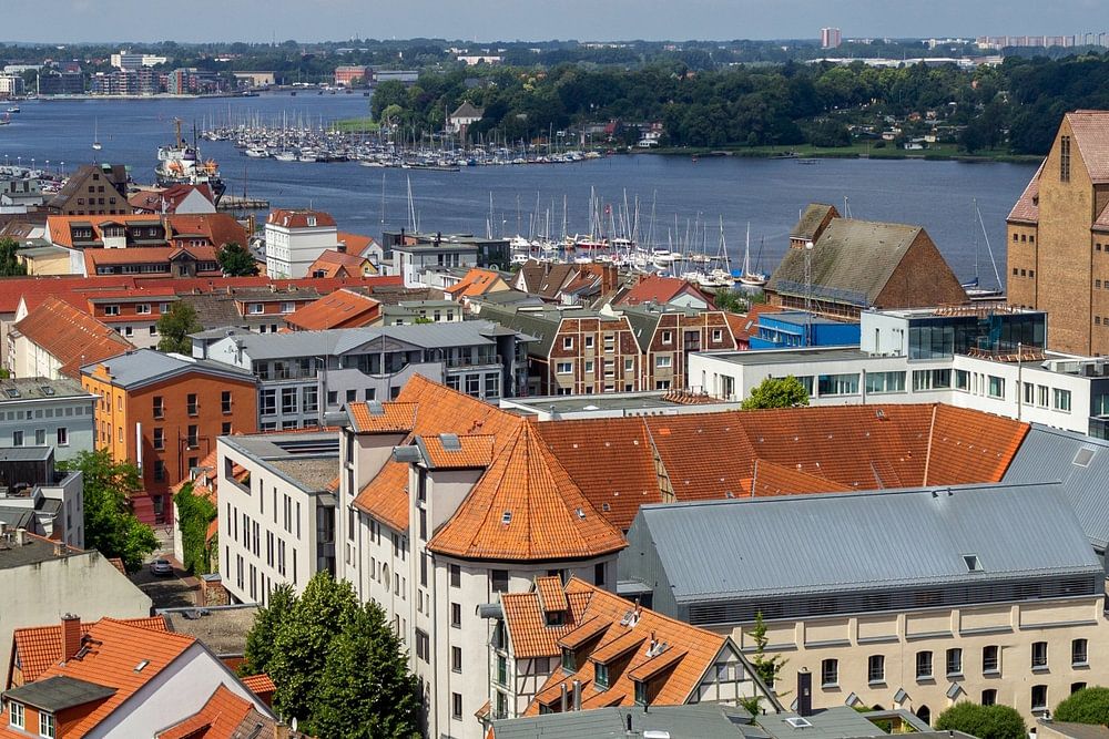 Panoramablick vom Aussichtsturm der St. Petri Kirche auf die Hansestadt Rostock