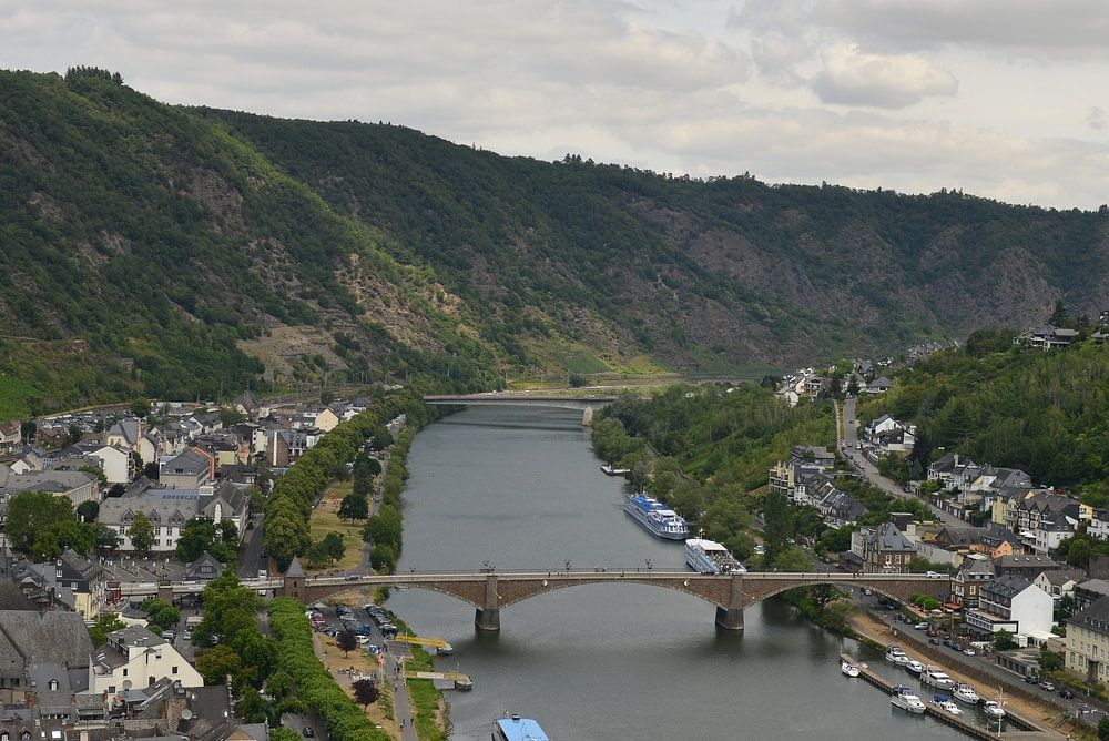 Foto von der Burgmauer der Reichsburg Cochem aus aufgenommen. Der Blick geht über das schöne Moseltal. Im unteren Teil des Bildes sieht man die Weinreben, die die Burg säumen. Im Inneren der Burg kann man die Atmosphäre des mittelalterlichen Rittertums spüren. Und unten können Sie einen Ausflug entlang der Mosel machen, vorbei an schönen Fachwerkhäusern. Und das alles nur eine kurze Autofahrt von Monschau entfernt.