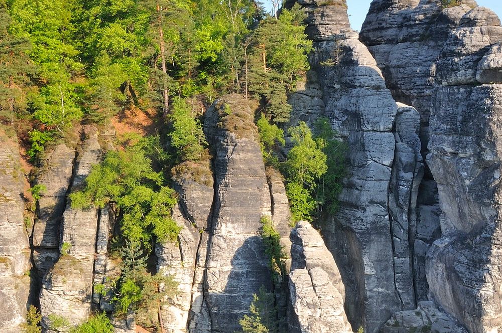 Blick von der Bastei zu den Wehltürmen (Ferdinandstein) im Frühjahr