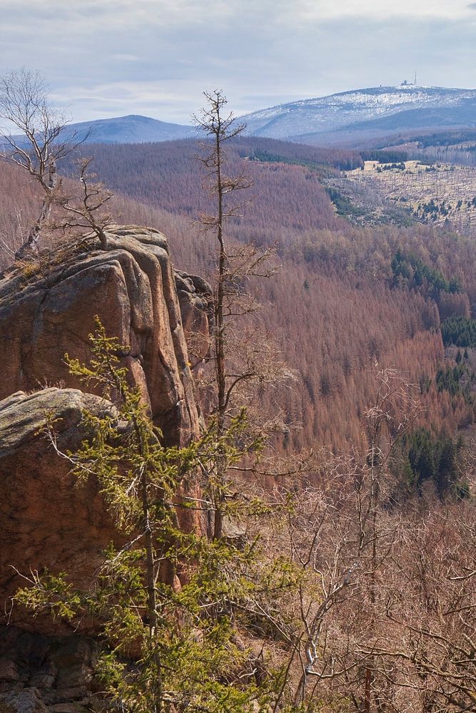 Blick von der Rabenklippe zum Brocken im Winter, Harz, Niedersachsen, Deutschland, Europa