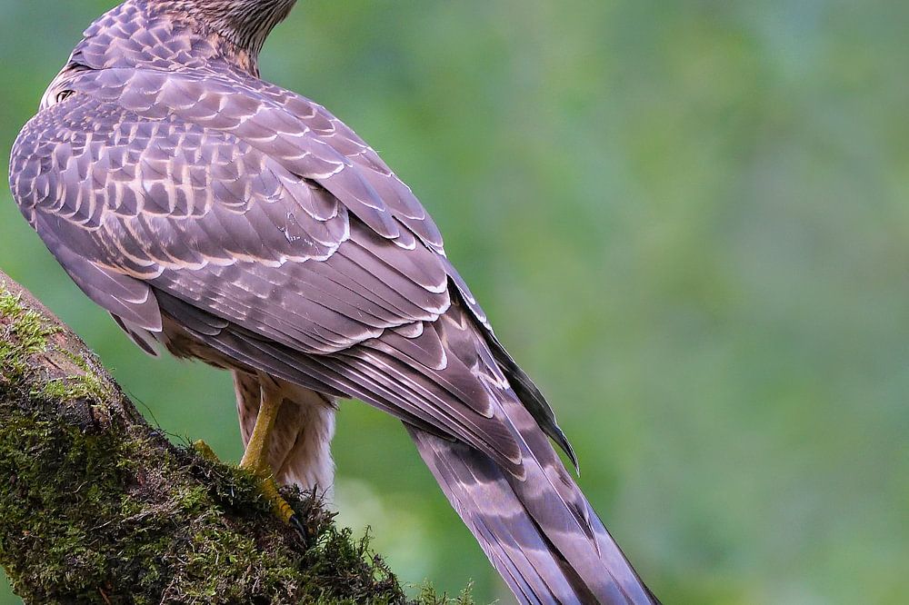 Junger weiblicher Habicht, der sich auf einer Waldlichtung mit den zarten grünen Farben der Vegetation im Hintergrund auf der Suche nach Nahrung umsieht.
