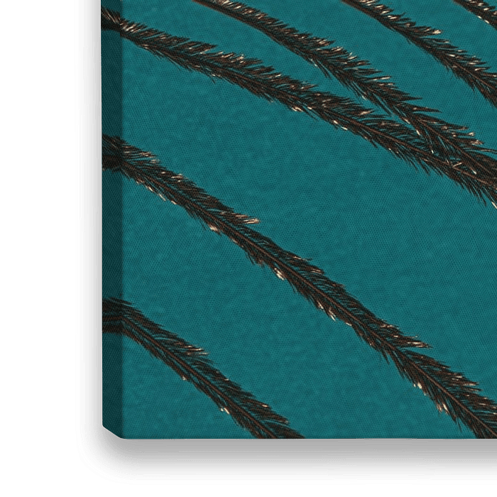 Bestelle dieses moderne Wandbild Blickfang: Panorama einer Pfauenfeder mit türkisfarbenem Hintergrund von Marjolijn van den Berg als Reproduktion auf Leinwand, Alu-Dibond, als Poster, Fototapete oder Acrylglasbild.