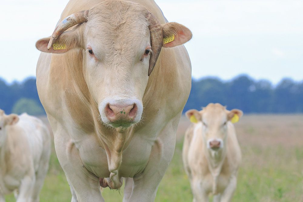 Ein Blonde d'Aquitaine Zuchtbulle steht aufmerksam auf einer natürlichen Wiese in der Drentsche Aa Nationale Bach- und Esdorpenlandschaft. Zwei seiner Kälber stehen diagonal hinter ihm.