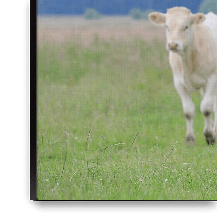 Bestelle dieses Kuh-Wandbild Blonde d'Aquitaine-Stier mit zwei seiner Kälber auf der Weide von Henk van den Brink als Reproduktion auf Leinwand, Alu-Dibond, als Poster, Fototapete oder Acrylglasbild.