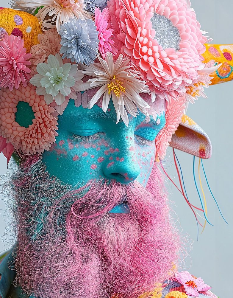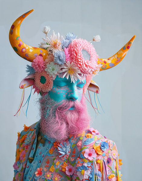 Porträt mit einer auffälligen Kombination aus menschlichen und legendären Zügen. Der Bart und der Schnurrbart sind in auffälligem Rosa gehalten, während die Haut in einem bemerkenswerten Türkis leuchtet.