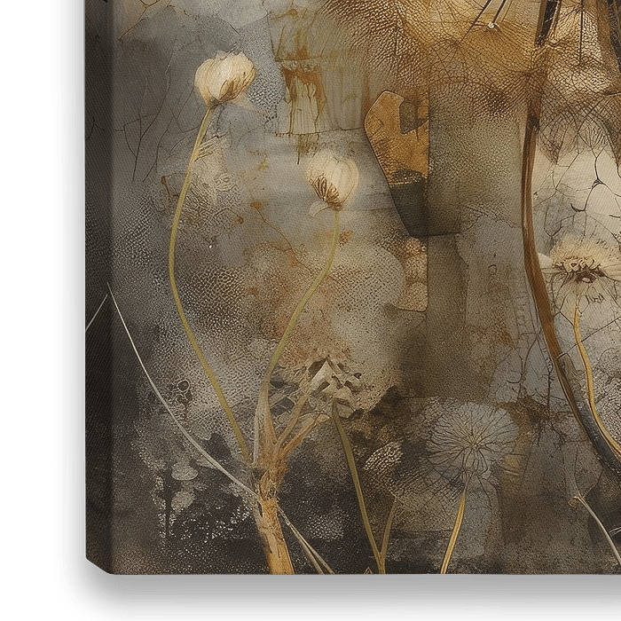 Das abstrakte Design ist ein Meisterwerk der modernen Kunst, das eine reizvolle Mischung aus Gold-, Braun- und Schwarztönen aufweist. Das Zentrum des Gemäldes wird von einer atemberaubenden Pusteblume dominiert, deren Blütenblätter in leuchtendem Gold gehalten sind und in einem strahlenden Glanz schimmern. Um die Blume herum ist das…