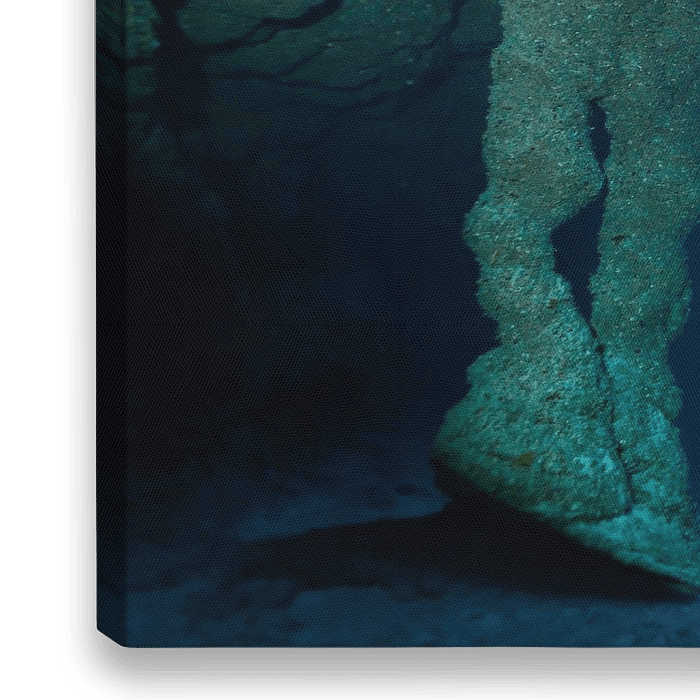 Taucher erkunden die mystische Unterwasserlandschaft des Blue Hole Belize in 45 Metern Tiefe.