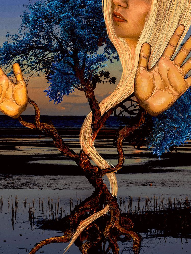 Diese Arbeit begann als ein loser Gedanke: ein Gesicht, das nicht nur blickt, sondern auch wächst – ein Mensch, der in der Welt Wurzeln schlägt. Ich kombinierte ein Fotoporträt mit Elementen der Landschaft, um eine Grenzfläche zwischen Mensch und Natur zu schaffen. Der Baum ist kein gewöhnlicher Baum; er ist ein Körper, der sich aus…