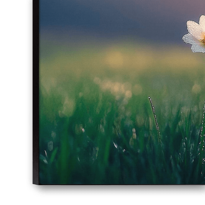 Inmitten der sanften Hügel und majestätischen Berge erwacht eine einzelne, strahlend weiße Blüte zum Leben. Ihr zartes Gelb in der Mitte leuchtet im warmen Licht der Morgendämmerung und vermittelt ein Gefühl von Hoffnung und Neubeginn. Dieses kunstvolle Stück passt perfekt ins Schlafzimmer, um eine ruhige und entspannende Atmosphäre zu…