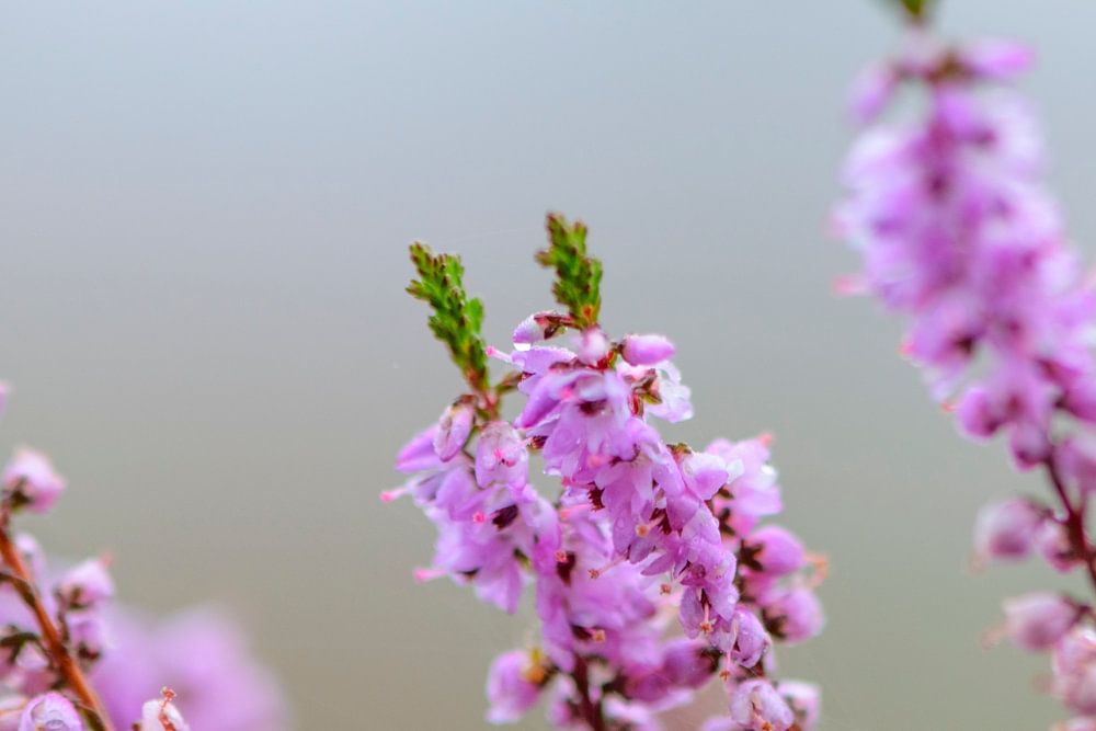Blühende Heidekrautpflanzen im Heideland bei Sonnenaufgang im Sommer im Naturschutzgebiet Veluwe in Gelderland, Niederlande.