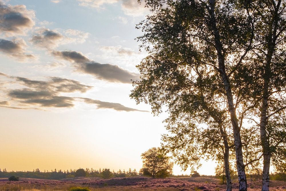 Blühende Heidekrautpflanzen (Calluna vulgaris) in der Heidelandschaft des Naturschutzgebiets Veluwe bei Sonnenaufgang im Sommer