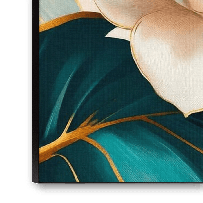Ein florales Meisterwerk entfaltet sich, überzogen mit samtigen, tiefgrünen Blättern, die mit goldenen Akzenten glänzen. Die strahlend weißen Magnolienblüten ziehen alle Blicke auf sich, während sanfte, geschwungene Linien eine harmonische Eleganz versprühen. Diese Komposition lädt ein, die Ruhe der Natur zu genießen und lässt den Raum…