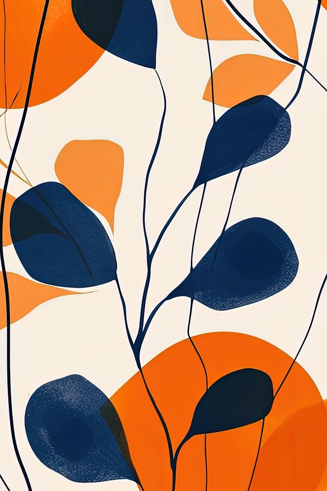 Die Kombination aus orangen und blauen Farben schafft eine lebendige und doch beruhigende Atmosphäre, die an einen warmen Sommertag unter einem klaren blauen Himmel erinnert. Blumenflecken scheinen neben stilisierten Blättern und Pflanzenstängeln zu schweben, sorgfältig ausbalanciert durch die eleganten, schlanken Linien, die sich durch die Leinwand schlängeln. Die Textur des Werks verleiht ihm Tiefe und Komplexität, während die Punkte und Streifen ihm ein Gefühl von Bewegung und Energie verleihen.