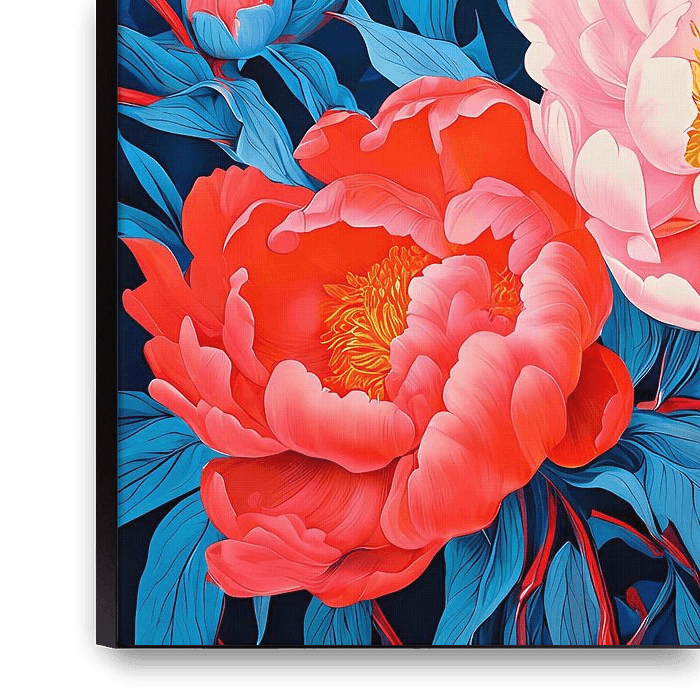 Dieses lebhafte digitale Gemälde fängt die üppige Schönheit von Pfingstrosen in voller Blüte ein. Die Künstlerin verwendet eine kräftige Farbpalette und kontrastiert den tiefblauen Hintergrund mit den feurigen Orangetönen und den zarten Rosatönen der Blüten. Die Blütenblätter sind mit einer malerischen Textur versehen, die Tiefe und…