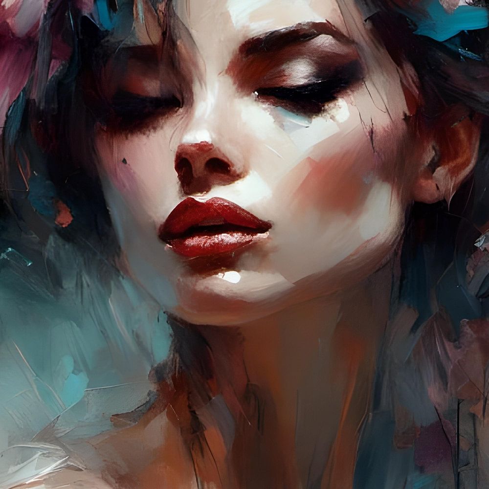 Eine Frau mit geschlossenen Augen ist mit einem Hauch von Gelassenheit dargestellt, geschmückt mit zarten Blumen in ihrem Haar, was eine Aura von Eleganz und Ruhe hervorruft. Die Pinselstriche sind ausdrucksstark und die Farbpalette ist eine harmonische Mischung aus sanften Blau-, Rosa- und Erdtönen, die dem Werk eine träumerische Qualität verleihen.