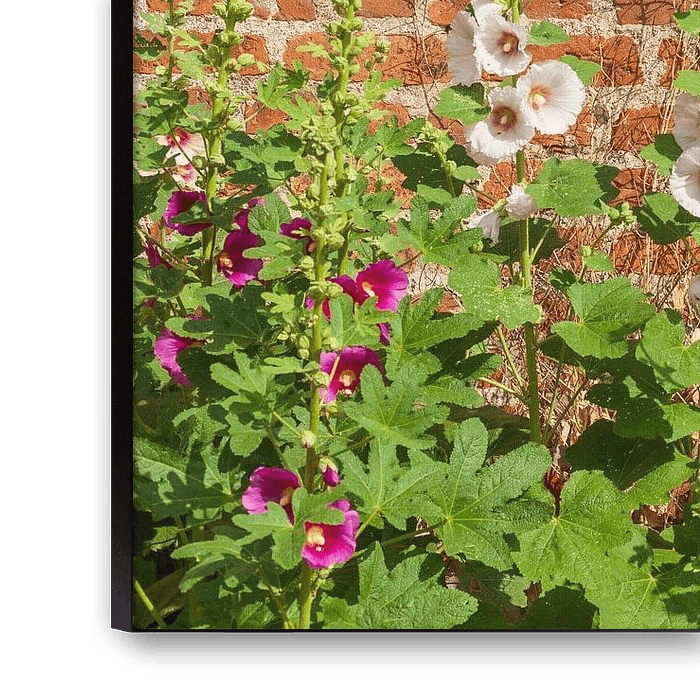 Blühende Stockmalven vor einem Tor an einer Backsteinmauer, Deutschland
