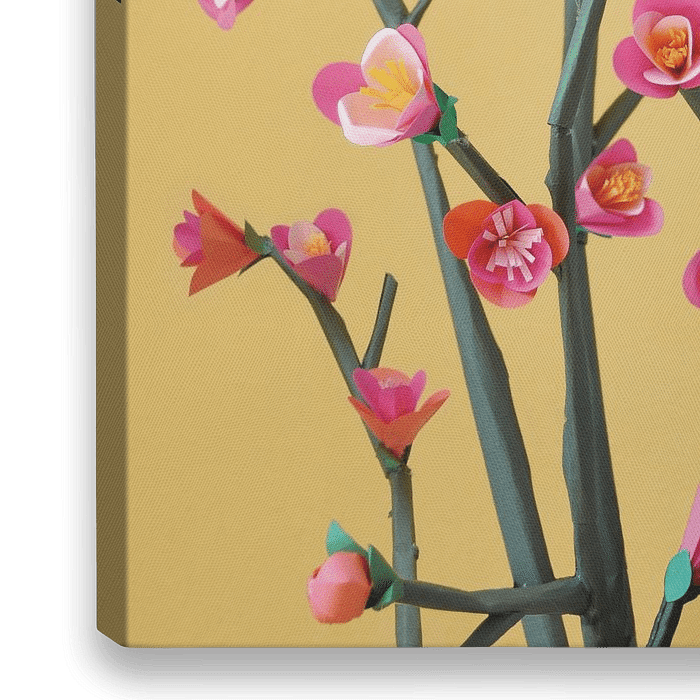 Papierblütenzweige mit rosa Blüten vor gelbem Hintergrund.