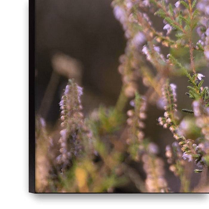 Bestelle dieses Blumen-Wandbild Blühende lila Heidekrautblüten mit Sonnenaufgang von Karijn | Fine art Natuur en Reis Fotografie als Reproduktion auf Leinwand, Alu-Dibond, als Poster, Fototapete oder Acrylglasbild.