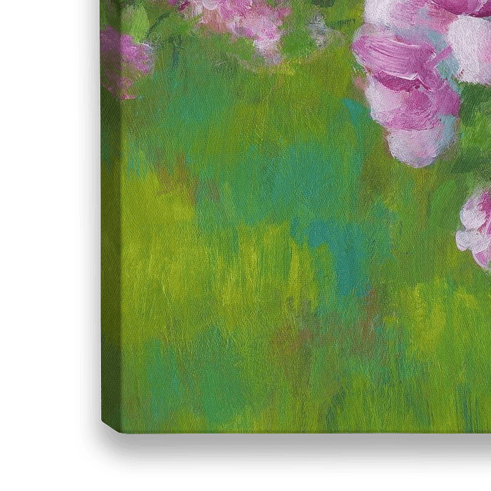 Ein Apfelbaum mit leuchtend rosa Blüten steht inmitten einer üppigen grünen Wiese vor blauem Himmel. Der Baum streckt einen Ast mit Blüten dem Betrachter entgegen, so dass diese zum Greifen nahe erscheinen und man den betörenden Duft der Apfelblüte beinahe riechen kann. Lockere Pinselstriche erzeugen ein lebendiges Gefühl von Textur und erwecken die Szene mit hellen und fröhlichen Farben zum Leben.