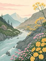 Eine ruhige Illustration, die einen gewundenen, hellblauen Fluss zeigt, der durch ein Tal fließt, das von sanften, felsigen Bergen umgeben ist. Der Vordergrund ist voller rosa und gelber Wildblumen, die zwischen grauen Felsen und grünem Gras wachsen. Einige immergrüne Bäume säumen das linke Ufer, während die Berge in der Ferne in einen…
