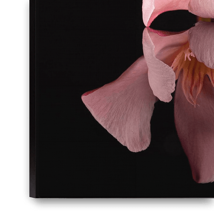 Eine Nahaufnahme des wunderschönen rosa Nerium Oleander. Nur in Nahaufnahme kann man sehen, wie schön und gedaileerd die Blume ist. Das Foto wurde vor einem schwarzen Hintergrund und auf einer reflektierenden schwarzen Platte aufgenommen. So ist ein Foto entstanden, das auf einer dunklen Wand großartig aussieht, aber natürlich auch…