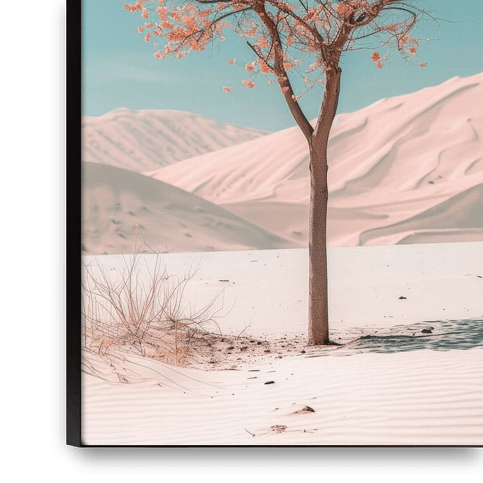 Dieses beruhigende, trendige Kunstwerk ist eine bezaubernde Darstellung eines blühenden Baumes, der sich unerwartet aus dem weichen, weißen Sand einer Wüstenlandschaft erhebt.