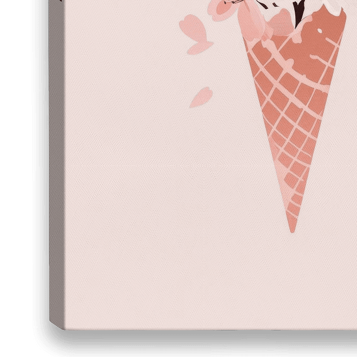 Ein zarter Traum aus Blüten und Farben entfaltet sich, während ein knuspriger Waffelbecher zauberhaft in die Höhe ragt. Rosafarbene Blütenblätter umgeben die filigranen Zweige, als würden sie im Frühling tanzen. Diese harmonische Fusion aus Natur und Süßigkeit lädt zum Schwelgen ein und verspricht einen erfrischenden Genuss für die Seele.