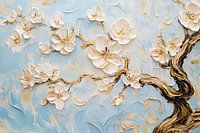 Dieses wunderschöne Design zeigt zarte Blüten, die sich vor einem sanften, blauen Himmel entfalten. Die Zweige des Baumes schlängeln sich elegant durch das Bild, während die weißen und cremefarbenen Blüten eine beruhigende und frische Atmosphäre schaffen. Die goldenen Akzente an den Zweigen verleihen der Szene einen Hauch von Luxus.…