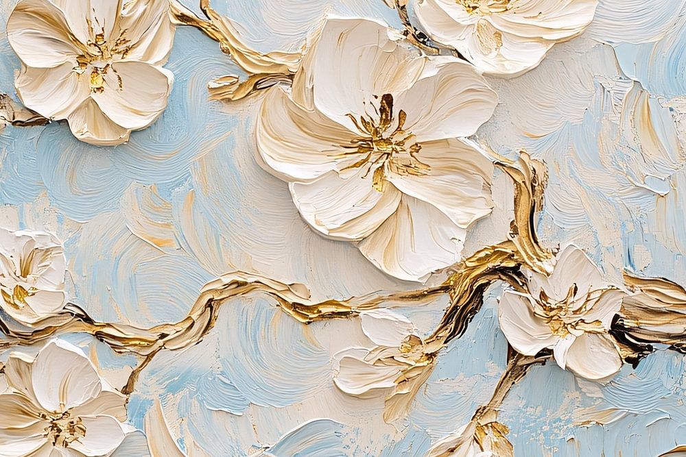 Dieses wunderschöne Design zeigt zarte Blüten, die sich vor einem sanften, blauen Himmel entfalten. Die Zweige des Baumes schlängeln sich elegant durch das Bild, während die weißen und cremefarbenen Blüten eine beruhigende und frische Atmosphäre schaffen. Die goldenen Akzente an den Zweigen verleihen der Szene einen Hauch von Luxus. Dieses Kunstwerk eignet sich perfekt, um jedem Raum ein ruhiges und gelassenes Aussehen zu verleihen, insbesondere in Schlaf- oder Esszimmern. Die Kombination aus sanften Farben und fließenden Formen vermittelt ein Gefühl von Frieden und natürlicher Schönheit. Ideal für Liebhaber von Blumen und eleganter, klassischer Kunst.