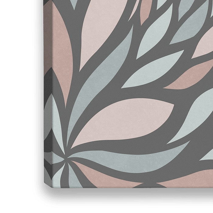 Dieses Kunstwerk ist vom Frühling inspiriert. Verschiedene Farben der Blütenblätter wechseln sich ab. Gemalt in einem modernen skandinavischen Stil. Die hell- und dunkelrosa Blätter und die blauen Blätter sind auf abstrakte Weise dargestellt.
