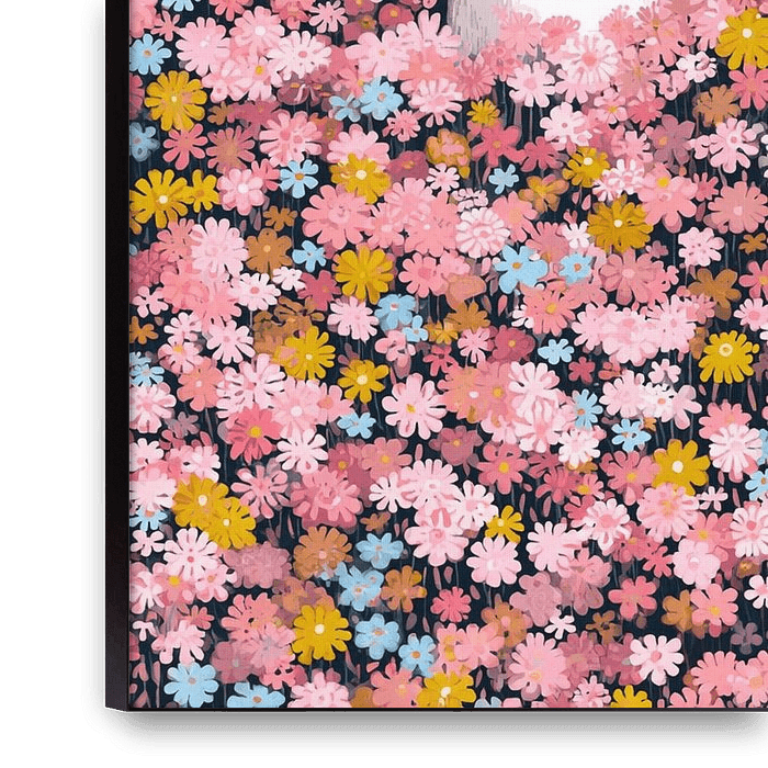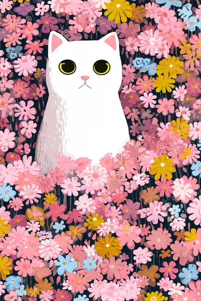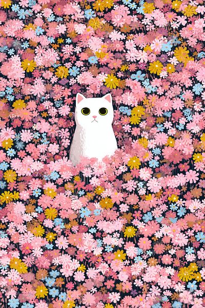 Eine sanfte weiße Katze sitzt friedlich inmitten von rosa, gelben und pastellfarbenen Blumen. Der sanfte Kontrast zwischen der Figur und dem leuchtenden Blumenhintergrund ruft Wärme, Unschuld und eine märchenhafte Ruhe hervor.