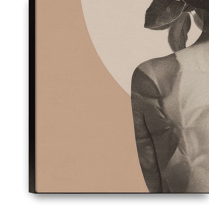 Eine faszinierende Verschmelzung von Mensch und Natur entfaltet sich hier: Eine zarte Silhouette wird von üppigen Blumen gekrönt, die in sanften Pastelltönen erblühen. Der harmonische Kontrast zwischen dem blühenden Haupt und dem minimalistischen Hintergrund schafft eine Atmosphäre der Ruhe und Anmut, als ob der Körper selbst Teil einer…