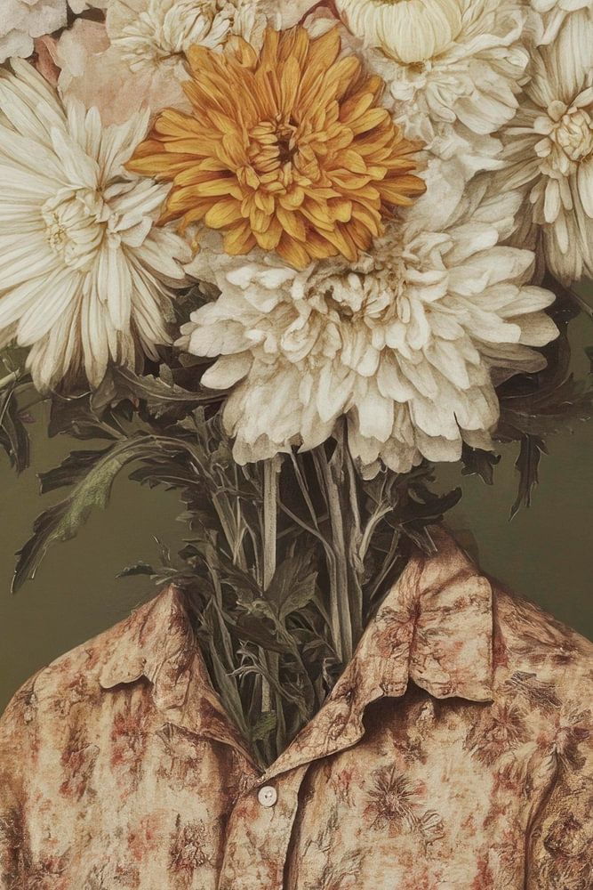 Das Bild zeigt eine Person mit einem Kopf aus üppigen, bunten Blumenarrangements, die in lebhaften Farben erstrahlen. Der Körper ist in ein florales Hemd gehüllt, was eine harmonische Verbindung zwischen Mensch und Natur schafft. Die Blumen verkörpern Frische und Kreativität, während der einfarbige Hintergrund die Komposition zusätzlich hervorhebt.