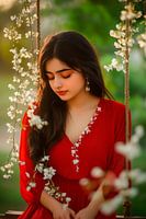 Inmitten einer blühenden Frühlingslandschaft strahlt eine junge Frau in einem roben roten Kleid, umgeben von zarten weißen Blüten. Ihre sanfte Ausstrahlung und die harmonische Farbkomposition verleihen dem Raum eine romantische Note. Perfekt für das Schlafzimmer, schafft dieses Bild eine einladende Atmosphäre der Ruhe und Inspiration.