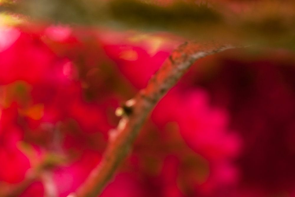 Diesen Blütenzweig habe ich im japanischen Garten auf dem Landgut Clingendael in Den Haag fotografiert. Durch den Einsatz eines Teleobjektivs ist es mir gelungen, einen fast abstrakten Hintergrund zu schaffen, in dem die Blüten nur noch als Farbflecken erscheinen. Nur das grüne Frühlingslaub am Zweig ist scharf abgebildet.