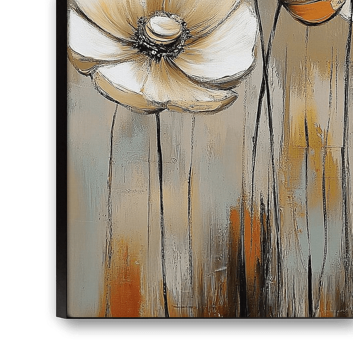 Flowers Abstract | Soft Whispers of Spring - Dieses Blumengemälde zeigt große, stilisierte weiße Blumen mit schwarzen und goldenen Zentren, gemalt vor einem abstrakten Hintergrund aus weichen Beige-, Braun- und Orangetönen.